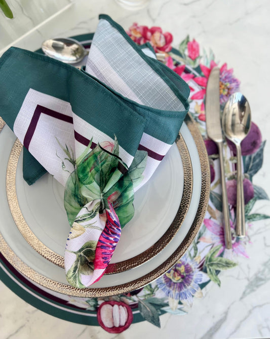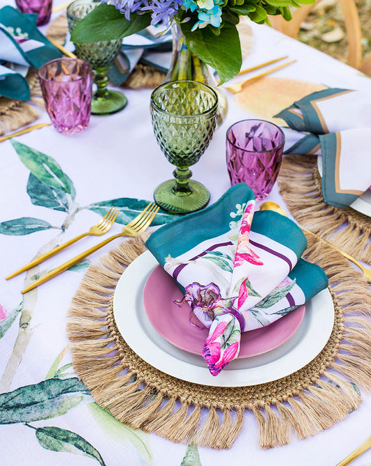 Embrace the beauty of nature with our Botanical Fabric Charger Covers. These easy-care covers feature vibrant mangosteens, lemons, and passion fruit flowers, bringing a burst of color and freshness to your table. Meticulously crafted with attention to detail and easy maintenance in mind, they effortlessly elevate your dining experience. Each set includes covers for your charger plates, perfect for both casual and formal settings. Create a captivating and inviting atmosphere with these botanical-inspired charger covers.